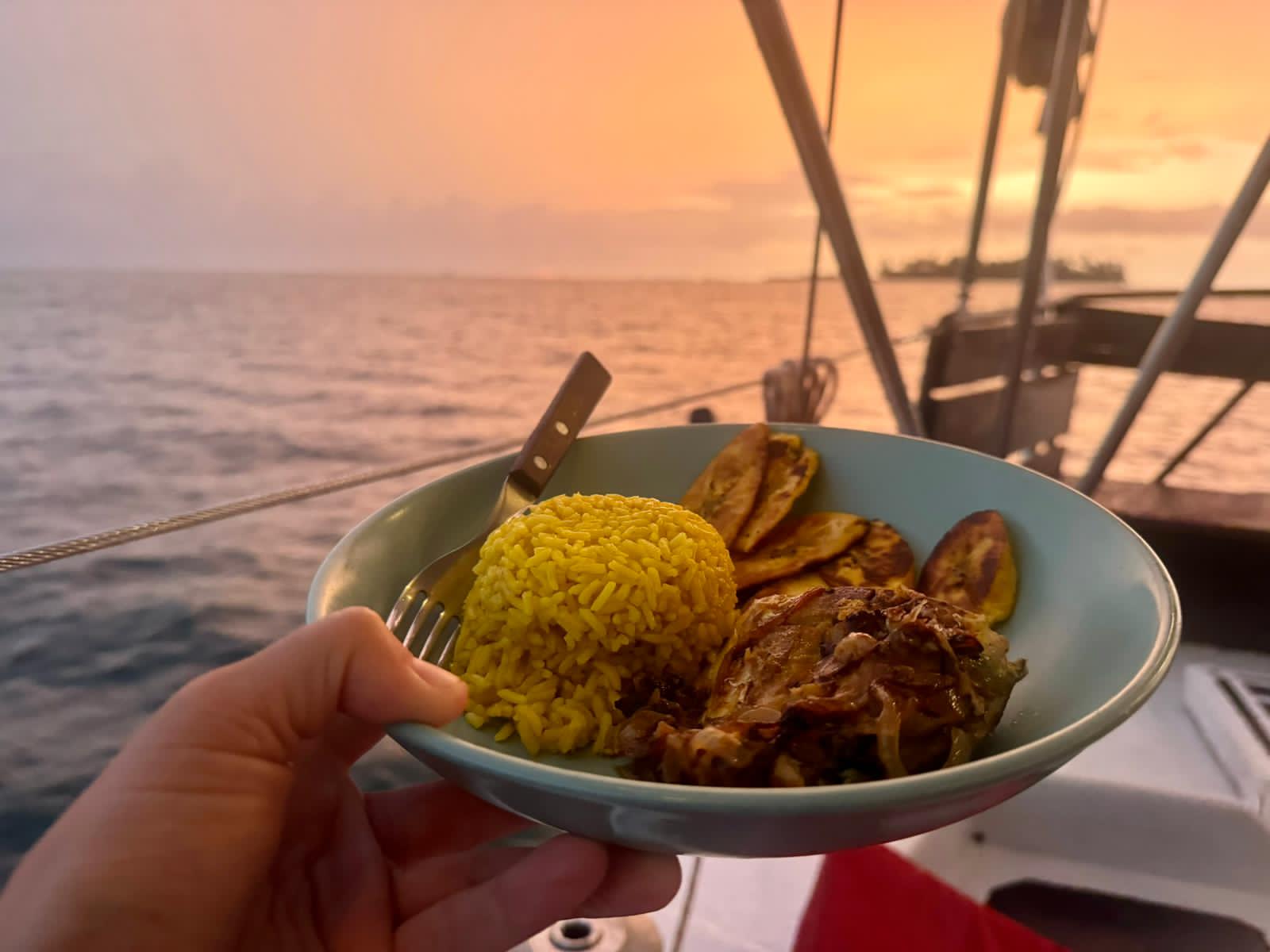 In this post, I’ll share what it’s like to cook at sea, the ingredients we use, how I learned from Guna women and fellow sailors, and end with a Caribbean lobster paella recipe we often make aboard.