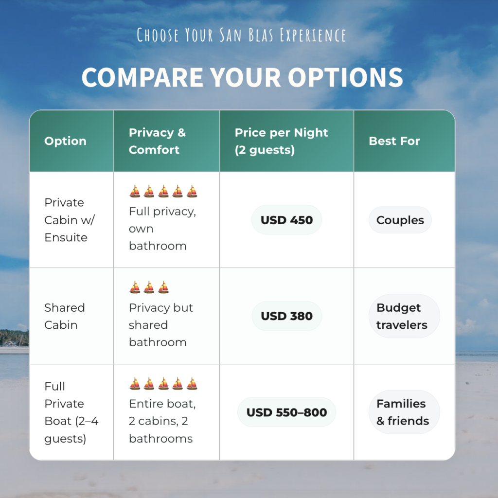 Updated 2025 San Blas sailing prices for shared cabins, private boats, and combo packages.